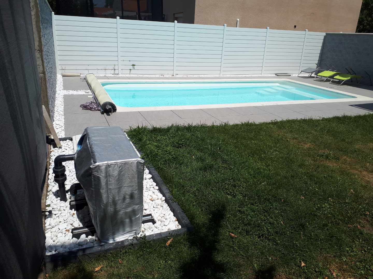 Installation d’une piscine coque modèle Jersey à Lezoux équipée d’une pompe à chaleur et d’une bâche à barres, ainsi qu’une piscine modèle Martinique installée à Riom équipée d’une pompe à chaleur combinée avec un volet hors sol.